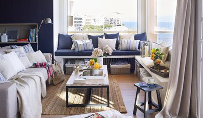 En un mismo espacio se pueden hacer combinaciones con distintos elementos en Blue Classic como en el caso de la imagen, pared, sofá, taburete, todos contrastando con el resto de los tonos crudos.
