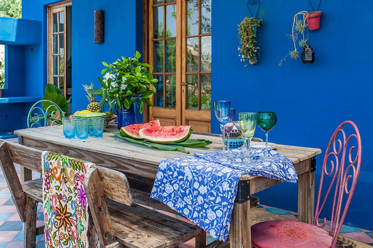 Si lo que quieres es decorar un espacio exterior como un porche o una terraza te damos ideas de como puedes combinar el azul en las paredes y combinarlo con tonos rosas en distintos elementos como es el suelo y las sillas todo combinado con una mesa antigua de madera natural encerada, obteniendo un resultado acogedor y de estilo mediterráneo que hará que tus momentos de exterior sean muy agradables.